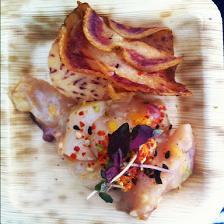 370 Common Kitchen + Drink, produced a traditional ahi poke dish including macadamia nuts, sesame oil, Hawaiian salt and taro chips. Chef Antonio Friscia of Gaijin Noodle + Sake House prepared a dish consisting of local yellowtail, bay scallops, and octopus with preserved chili yuzu, uni, and micro shiso atop a sweet potato chip.