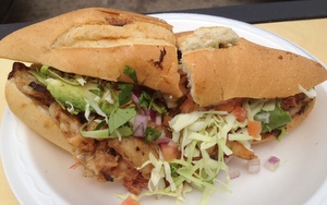 I recently sampled the Fisherman's Torta ($10), which consists of battered fish, grilled catch of the day (this time it was red snapper), baby scallops, smoked marlin, and shrimp, topped with avocado, cabbage, cilantro, and onion. This huge sandwich is so satisfying and really an amazing combination of ingredients, making every bite a new adventure. Top it with a sampling of Oscar's house made hot sauces for an added kick. The avocado cilantro lime sauce and the habanero white sauce are both to die for.