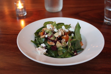 Because PK prides itself on utilizing the freshest ingredients, the menu is fairly limited, seasonal, and changes often. The daily soup is made at chef’s whim, and the flatbread rotates daily. We stimulated our palates with beet salad ($12.50): spinach leaves with avocado, juicy tangerines, crunchy almonds, and perfectly pungent goat cheese, mixed with flavorful red and yellow beets, all tossed in garlicky balsamic vinaigrette. The diverse flavors and textures made for a very exciting salad.