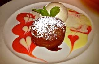 Granted we shared each of these appetizers, so we were not left feeling overly full and lethargic as we would after consuming such an array of food, but rather given a comfortable fullness which we accredit to Chef Window’s overriding theme – crisp, fresh, and light. Feeling confident in my unmatched ability to indulge, we ended the meal with the warm melting chocolate decadence ($9): a house made lava cake, goo-ing with extremely (but not overly) rich fudge, served with homemade vanilla gelato, and complemented by artfully designed hearts of strawberry and vanilla coolies. The outer cake was crisp and moist at the same time, and the gooey center was just heavenly!