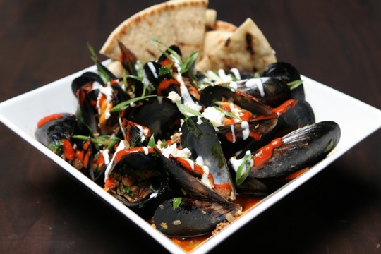 Tequila Steamed Mussels (Pictured Above), Piquillo Pepper Sauce, Mexican Crema, Cilantro + Scallion