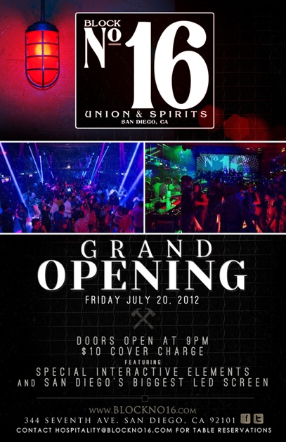 Block No. 16 Union & Spirits is located at 344 7th Avenue and will initially be open on Friday and Saturdays from 8:00 am – 2:00 am. In addition to its normal business hours, the venue will soon be open before any home Padres game played on Wednesdays, Saturdays and Sundays. More information and entertainment lineups can be found at www.blockno16.com, as well as on Block No. 16's Facebook and Twitter pages.