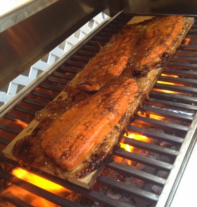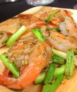 Sam went through his menu, the ingredients, and his cooking procedure as he prepared the five courses, each paired with a different wine. Everything was provided by Grocery Outlet, and not including the booze, the entire 5 course meal for about 25 guests cost a whopping $86. We started with mashed potato tacos with sour cream, chives and hot sauce, which were perfected by the texture of crushed potato chips. Next we had salt & pepper shrimp, shells on and deveined, with garlic, ginger and chives. The next course was a cedar plank salmon, with large filets cooked on a grill atop of cedar planks sourced from