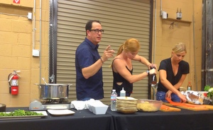 After losing our bargain relay, the group headed to the back warehouse area where several tables were waiting, donned with linen tablecloths, nice silverware, and glasses of wine. Sam "The Cooking Guy" was organizing his sous cooks behind a table topped with several burners and ingredients. He immediately eased any pretense with jokes and quips, revealing himself as a very down to Earth gentleman.