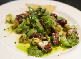 White marble countertops are complemented by surrounding dark wood, as well as walls of oak logs to be used to fuel the brick oven. The abundant selection of wines are dominantly perched above the main dining area. The space is simple, elegant, and modern, yet warmed by the partially open kitchen and brick oven centerpiece (the only cooking apparatus). A quaint front patio overlooks Little Italy's thriving India Street and a chic back area is encased with greenery.