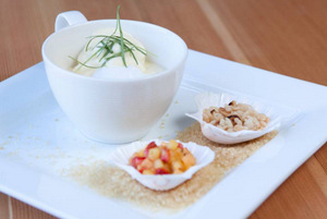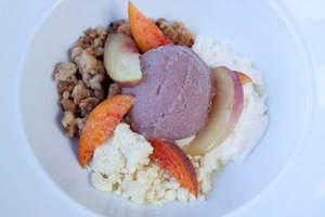 · Real Housewife Breakfast – White wine poached fruit, scrambled egg cream, granola and milk crumble, date sorbet