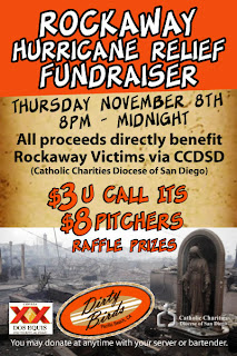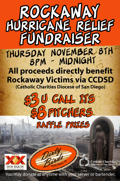 San Diego is filled with east coast transplants that now call America's Finest City home. Leigh Gibson, co-owner of both Dirty Birds in Pacific Beach and The Commons downtown, is formerly of Long Island, NY, and being that Dirty Birds itself employs many East Coast transplants, the restaurant will be holding a Hurricane Sandy fundraiser specifically to benefit the people of Rockaway, NY (one of the hardest hit areas by the storm), via the Catholic Charities Diocese of San Diego this Thursday, November 8th from 8pm to 12am.