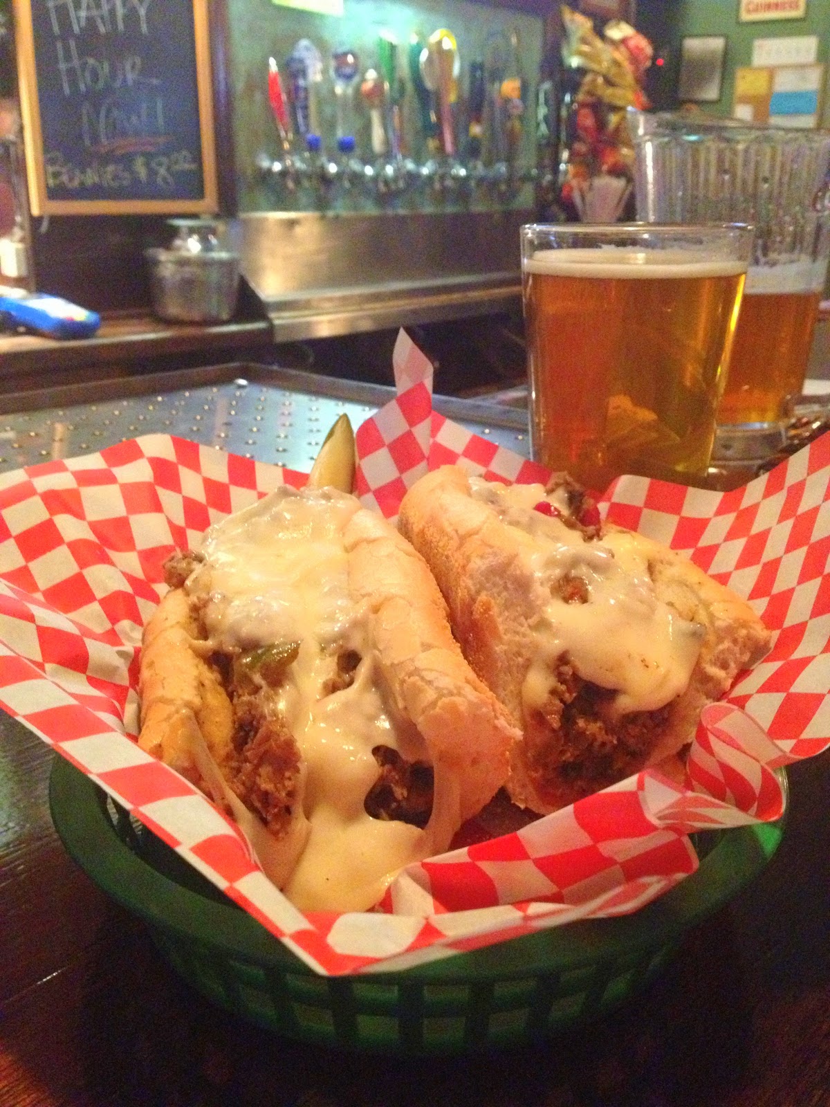 Of the huge selection of sandwiches on the menu, we went with a 12" classic cheesesteak ($8.95), merely substituting the regular peppers with spicy cherry peppers (really hot). The vegetables are cooked in with the meat, so every bite gives you the combination of onion, mushroom, chillis, salt and peppered beef, and melted cheese. The bread is the ideal consistency, enveloping the interior ingredients like a thin, crusty shell. Our one wish is that we had the wherewithal to specify provolone for our cheese of choice rather than mozzarella. Although the fresh motz was gooey and delicious, my memory of a classic cheesesteak includes the sharpness of provolone. Be sure to grab a drink or two if you plan on getting hot peppers - we cooled our scorched taste buds with an icy pitcher of Racer 5 IPA.