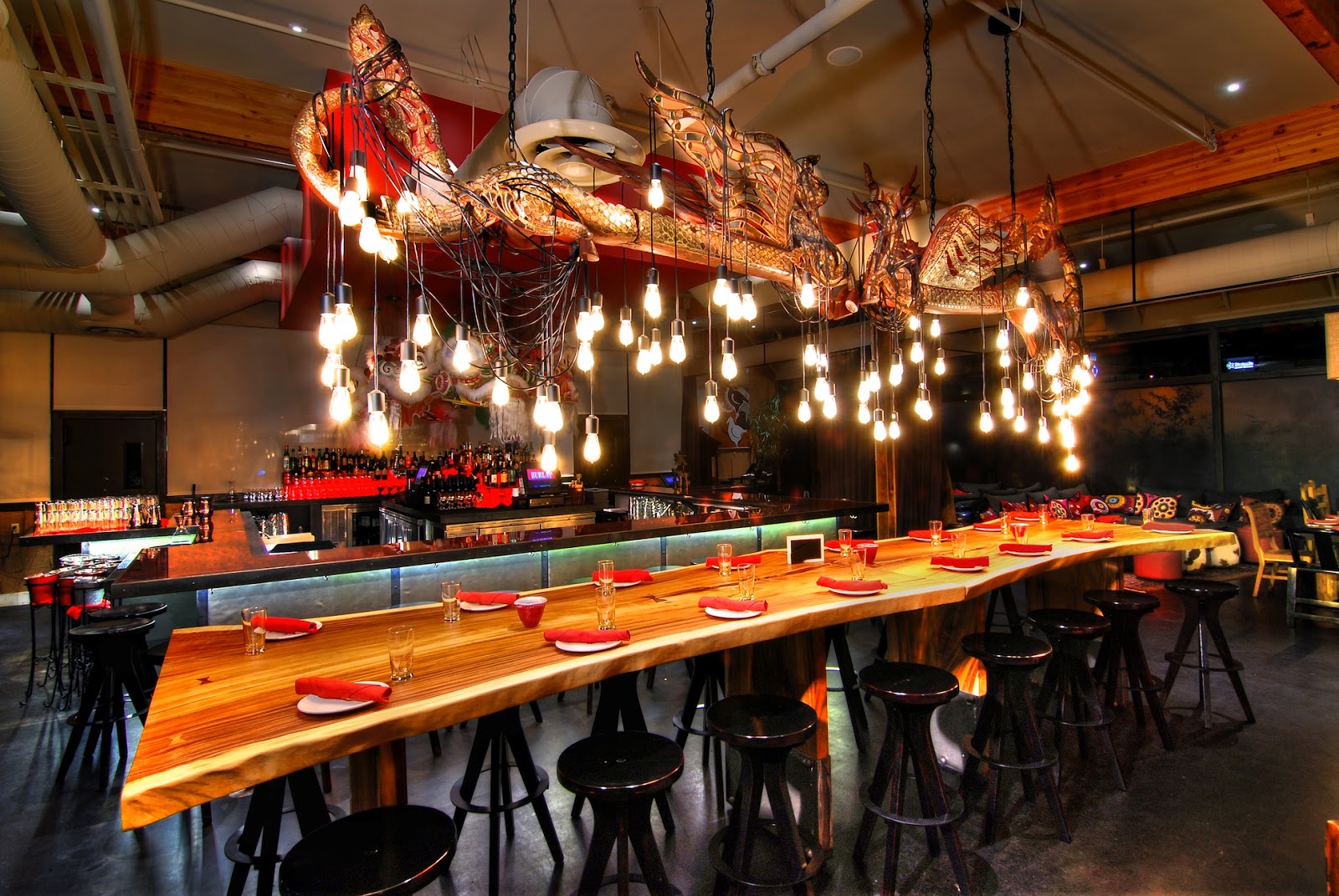 Chef Sinsay recently hosted us for dinner at Burlap to try some of his latest creations. Like most of the other fabric-named eateries, Burlap boasts an exhibition kitchen, eclectic seating options including a covered patio, and maintains a theme that stays true to the playful form of Malarkey's other restaurants, and of course, offers a take on 'shrimp and grits.' Festive dragon heads hang over the bar and dragon fixtures and bull heads decorate the various dining areas. Burlap fabric drapes the walls and hangs in the form of light fixtures and curtains. A bit warmer and livelier than the other Malarkey restaurants we've sampled, Burlap makes for an entertaining and tasty experience fit for either a lengthy meal or casual drinks and appetizers. Make it what you want.
