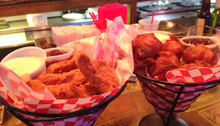Both the chicken fingers and the stuffed shrimp came out piping hot, crispy, and served with a side of yummy fries. Warning: As difficult as it may be with the tantalizing bacon before you, do not bite into the shrimp for at least 5 minutes - they are scalding and filled with volcanic, cheesy deliciousness. An AMAZING comfort food, the bacon was artfully wrapped tightly around the ingredients and crisped to perfection; the shrimp was fresh and firm, and the filling was spicy and creamy. As a chicken finger eater of nearly 30 years, I can also vouch for those bad boys. They were thin and tender with a nice, light crust. After snacking, we ordered another round of beers and a French Dip for the road (a scrumptious late night snack).