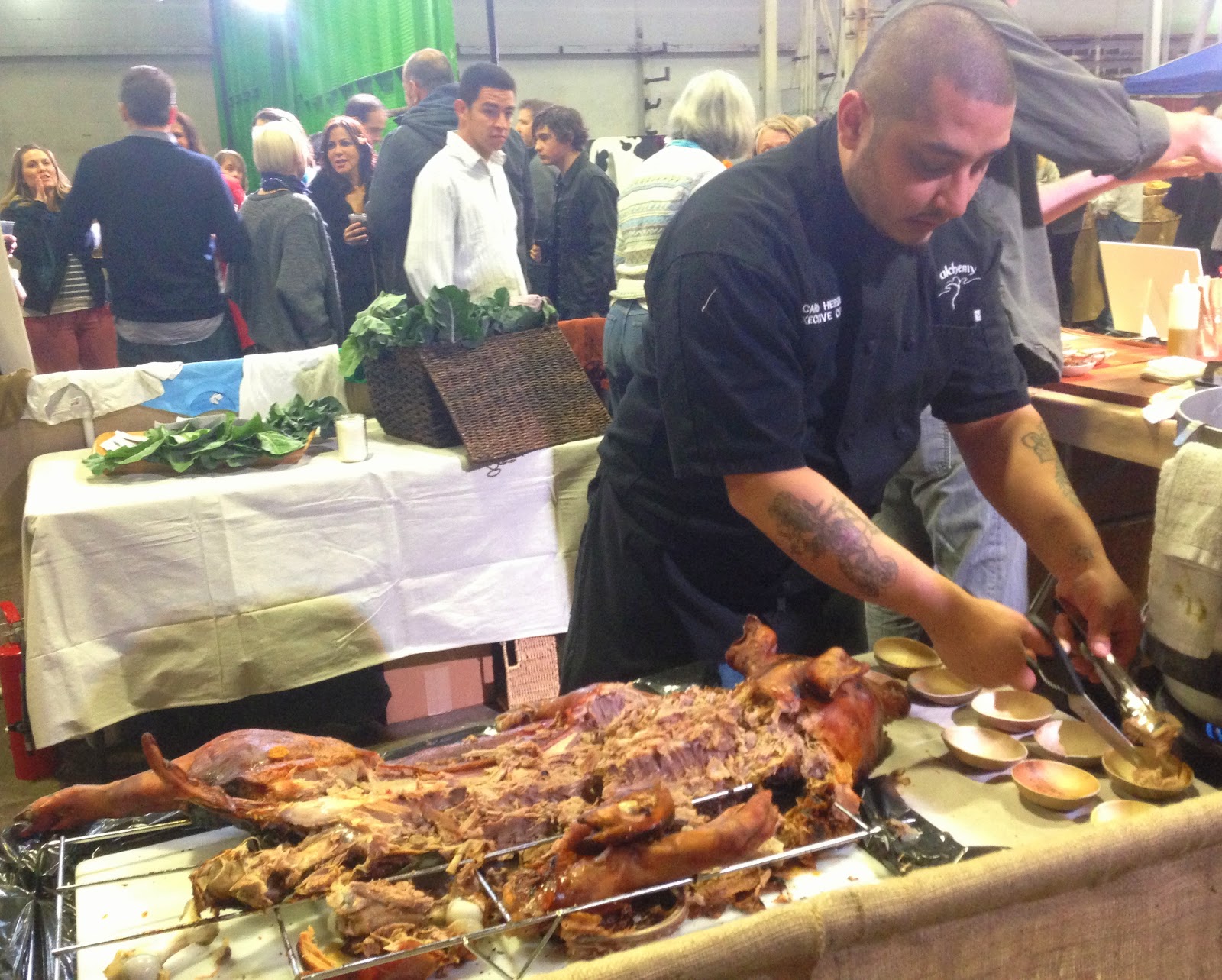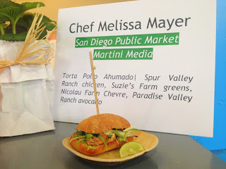Another chef and co-organizer, Melissa Mayer, had a lively torta stand, made festive with traditional decor and a smattering of empty Tecate cans as well as a legitimate salsa bar (those Serrano's were FIRE). Cafe Chloe outfitted a mini-French Patisserie and cafe, offering up finger sandwiches of ham and gruyere, as well as stuffed croissants. Perfectly demonstrative of the charm, appeal and utility of a public market, crispy and chewy ciabatta from The Bread & Cie, warm homemade ricotta from Venissimo Cheese (along with honey and an incredible apricot chili sauce), and charchuterie from Chef Balistreri of Tender Greens were served in an assembly line to make a delicious sandwich. Chef Heredia from Alchemy was busy pulling port from a whole roasted swine, assembling delicious little pork stew tastes that were filled with flavor. Attendees wandered excitedly about the many food vendors while swirling wines, sipping beers from Stone Brewing, and swigging ciders from Julian Cider.