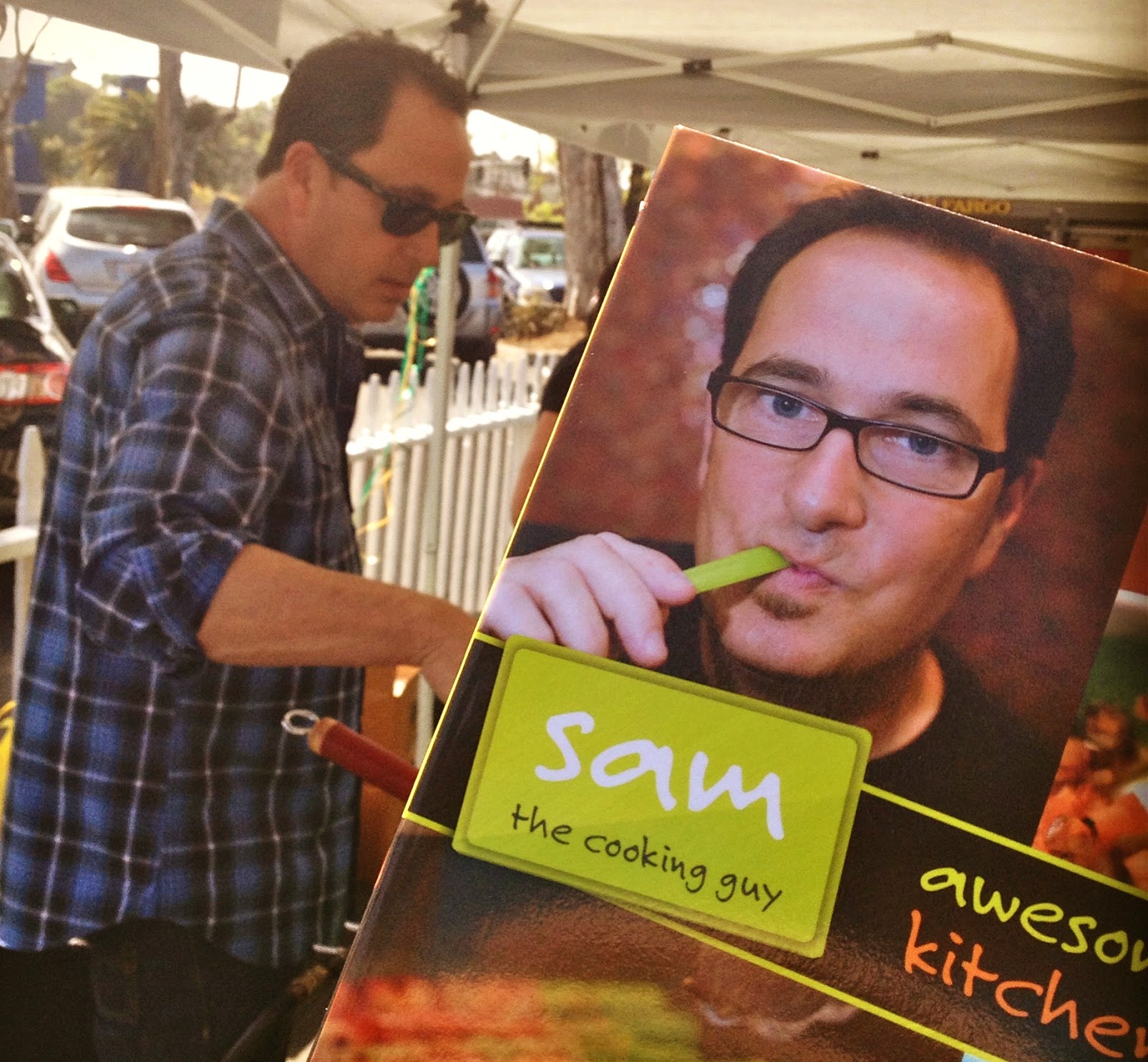 The event offered a meet-and-greet with the incredibly charismatic and crafty Sam the Cooking Guy as well as a sampling of his food. He was challenged with the task of using the ingredients from Point Loma Grocery Outlet to cook up some tasty treats for those in attendance. He began by tossing some shrimp into a wok and serving it up street taco style with corn tortillas, cabbage, and a delicious chipotle sour cream sauce. Sam then brought out some corn salad which he created using canned corn that he fired up in the wok until it tasted as if it had been roasted, YUM! His last trick was to delight the crowd with some blue cheese gnocchi that involved melting blue cheese crumbles into a pot of whipping cream, and adding peas, bacon, and gnocchi. Everything was delicious and I was quite impressed with Sam's ability to meet the culinary needs of the masses while also simultaneously signing books and taking photos with fans like myself! Not to mention, he was also kind enough to point out his favorite recipe in his book Just a Bunch of Recipes - can't wait to try your Black Bean Salmon, Sam!