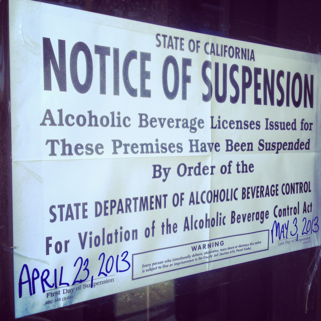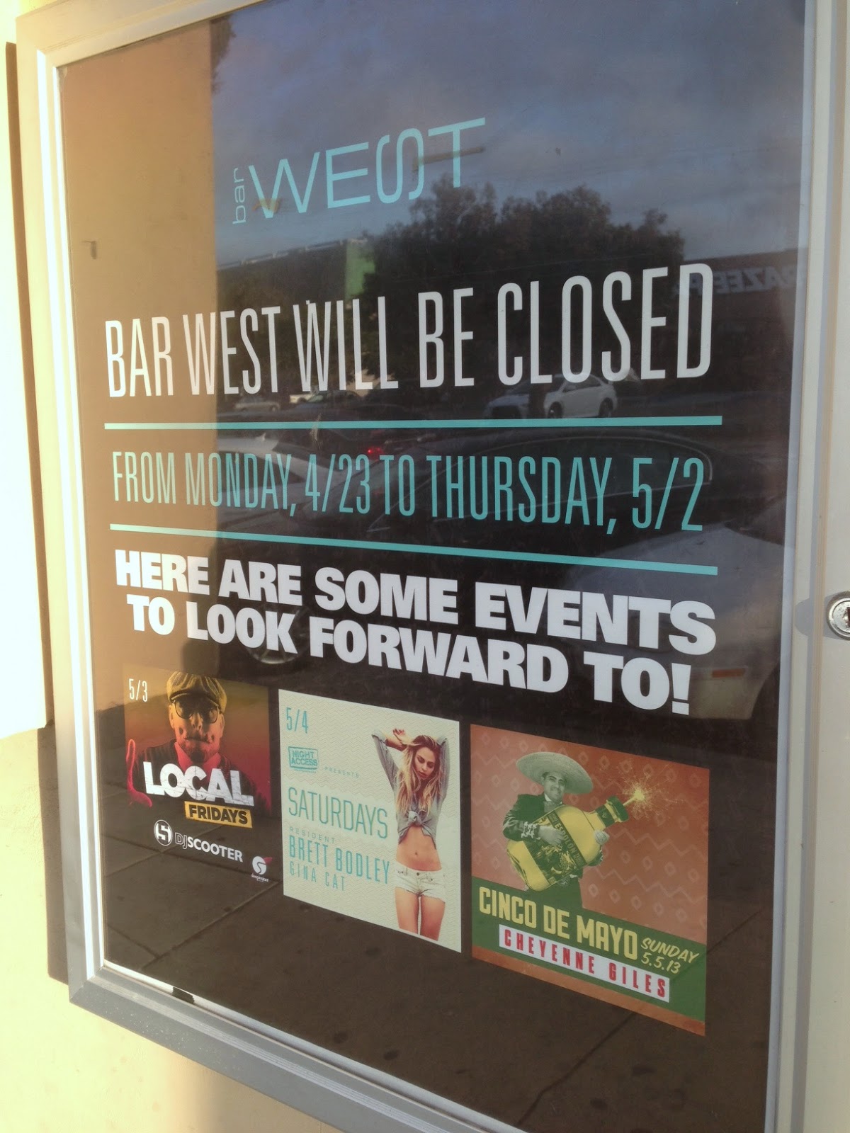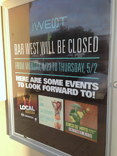 On today's saunter to the PB Tuesday Farmer's Market, we noticed that neighboring Bar West had an Alcohol Beverage Control (ABC) notice on its door informing passersby that the lounge would be closed until May 3rd. Speculating commenced via social media, and we soon got the whole story. Glory be the Internet.