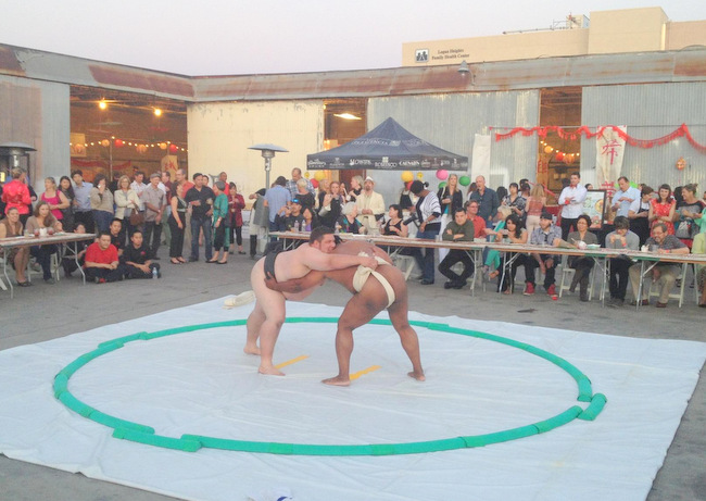 After hosting two outrageously successful events (A Taste of the Market & Street Food Market) in its main area in the Market Hall, this past Saturday the San Diego Public Market exhibited yet another portion of its enormous space housed on the National Plaza side of the building for Just Call Us Volunteers' 2nd annual fundraiser - Taste of Asia at the Market. As completely different as the last two events were from one another, this new portion of the warehouse showcased yet another very appealing side of San Diego's own public market. With a vast, open-air central atrium, the sprawling grounds were filled with sun throughout the late afternoon hours, offering the perfect setting for dragon dancing and sumo wrestling demonstrations. On the southern end, a sprawling indoor corridor was outfitted with quintessential Asian decorations and makeshift stands where chefs and restaurants were dishing out their take on Asian influenced drinks and eats.