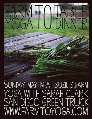 Farm to Yoga, Suzie’s Farm and San Diego Green Truck are coming together to create a truly unique event. On Sunday, May 19th, spend a relaxing day at Suzie’s Farm, indulging in the best of San Diego's yearlong harvest season. Tour the farm with Suzie's farmers and Farm to Yoga founder, permaculturist and yogi, Abby Paloma. Stretch out in Suzie’s shaded event space with a yoga class led by the gifted and inspiring teacher, Sarah Clark. Following yoga, nourish your body with an organic, farm to fork meal grown in Suzie's field and prepared by the holistic chefs, of the one and only, San Diego Green Truck team.