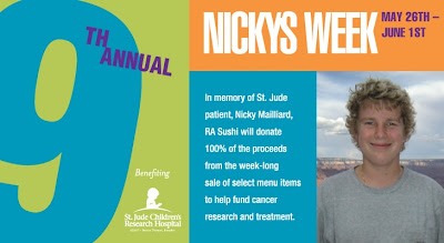 Nicky’s Week was developed in memory of St. Jude patient Nicholas “Nicky” Mailliard, of Scottsdale, Ariz., who lost a long battle with brain cancer in February 2005 at the young age of 13. A nephew of one of RA Sushi’s founders, Nicky held a special place in the hearts of RA Sushi associates throughout the organization. RA Sushi initiated the fundraiser to honor the memory of Nicky and to raise awareness and funds for St. Jude, where no child is ever turned away because of a family’s inability to pay for medical treatments.