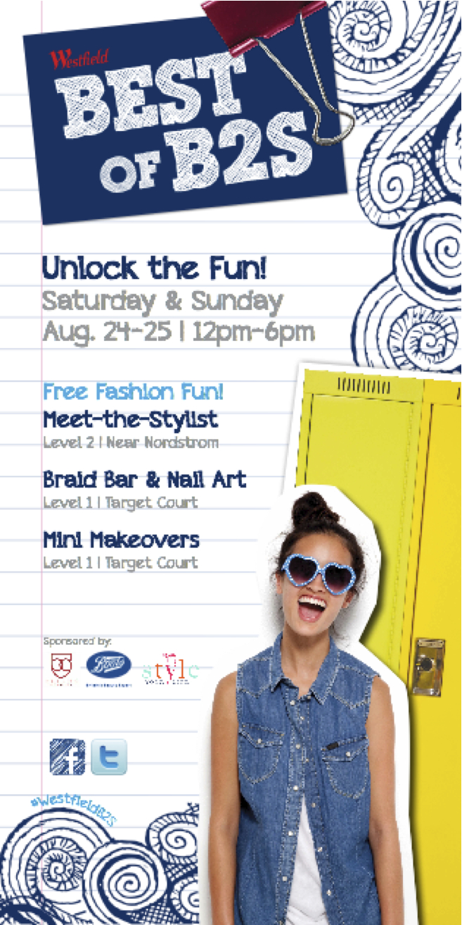 “Unlock the Fun” will be held indoors at Westfield North County with the locker installation located at Level 1 - center court; back-to-school styling at Level 2 near Nordstrom; and Braid Bar, mini-makeovers and nail art at Level 1 near Target court. This is a free family event for all ages.
