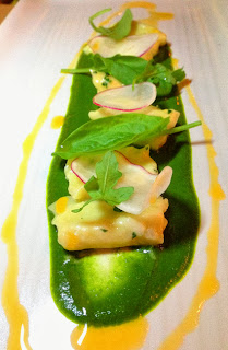 During our preview, we settled in with some Prosecco and tray passed spuntini (snacks). A beautiful latte marshmallow wowed the crowd, mixing baby heirloom tomato, basil and 18 year balsamic 'caviar' (think little poppable balls of delicious balsamic) for a sweet and savory concoction. The barolo soaked fig with whipped fromage blanc and prosciutto was a beautiful blend of California figs and Italian cured meat. The rabbit sausage took the crown due to the flavor and texture combination of the salty sausage, celery, dried plum and crispy rye toast. We didn't pass up seconds and thirds on that one!