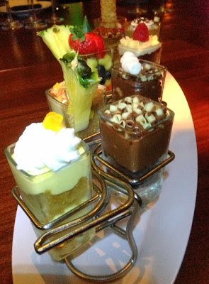 Surf & Turf under 475 calories?!? A New Zealand venison chop was joined by a half oak-grilled lobster tail, all atop truffle mashed potatoes, roasted brussel sproats and red wine demi glaze, paired with a 2011 De Toren Z from Stellenbosch. The venison was so tender and juicy. Although this was our last savory course and our bellies were filling, we couldn't help but gnaw on that bone...mmmmm.