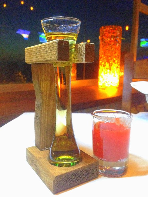 After scarfing down our sampler platter, we needed help digesting before our next course, so we ordered a shot of El Agave's anejo, which comes beautifully presented in a mini-yard glass served in an unfinished wood holder and a side of house-made sangrita. It was the perfect intermission between courses.