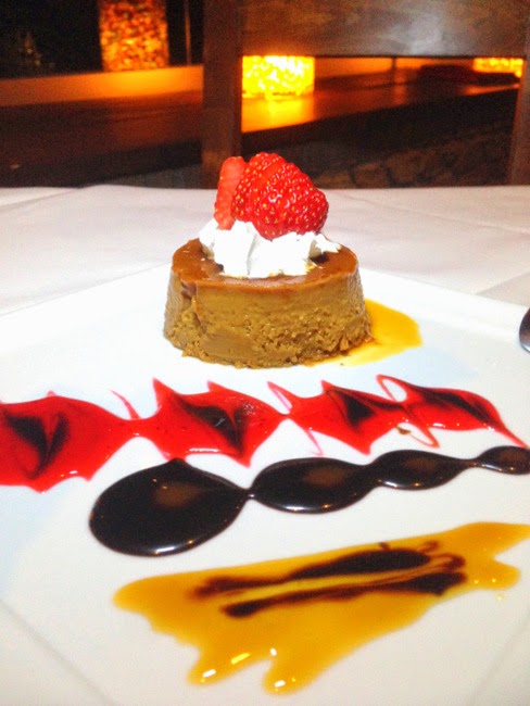 Of the three desserts on the menu, we received the caramel goat milk flan, topped with whipped cream and strawberry, and served with rasberry, chocolate and caramel sauces. I've never thoroughly enjoyed flan in the past, but this one was fantastic, as each gastrique was better than the last, and the flavors of goat milk added a unique and earthy taste to the flan making it sublime.