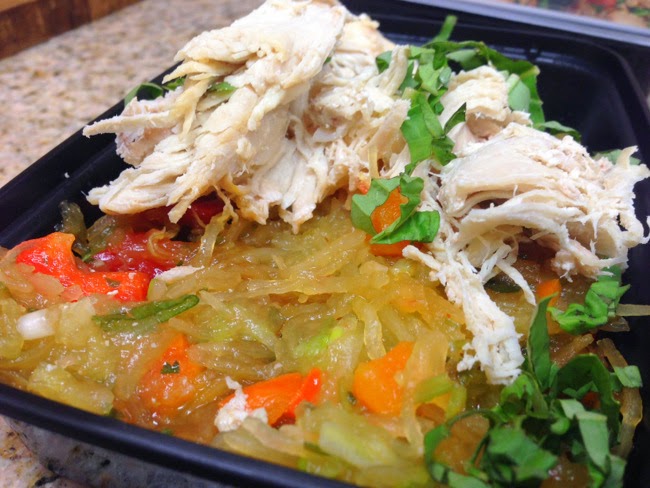 Spaghetti squash pad thai with spicy peanut sauce and organic chicken.