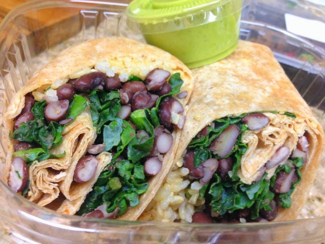 Black bean and kale burrito with organic brown rice with spicy avocado salsa.