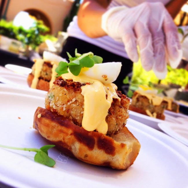 Waypoint Public: Chef Amanda Baumgarten - Baby Crab Cake Benedict on a pretzel bun with a smoked tomato hollandiase paired with Matt’s Burning Rosids