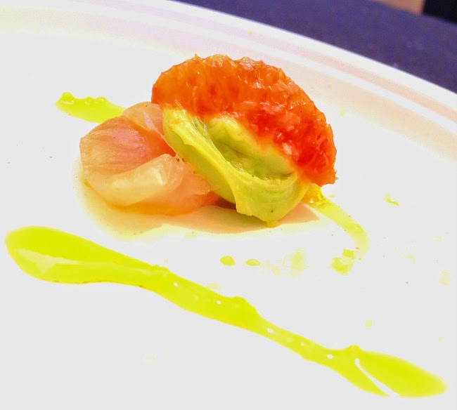 Encore Champagne Bar & Dining Room: Chef Ryan Studebaker - Hiramasa crudo: Blood orange, tarragon, avocado, hazelnut, and smoked salt - paired with Cali Belgique aged in Red Wine Barrels
