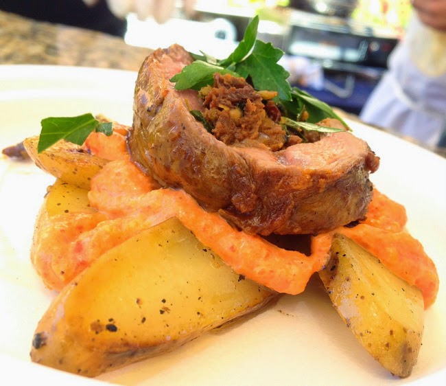The Wild Thyme Company: Chef Dawn Parks - Roasted leg of lamb, stuffed with Spanish chorizo, currants & swiss chard, basted with Aged Sherry Vinegar & EVOO /grilled spring onions, charred onion petals, romesco / Patatas Bravas in spicy tomato sauce paired with Stone Smoke Porter with Chipotle Pepper