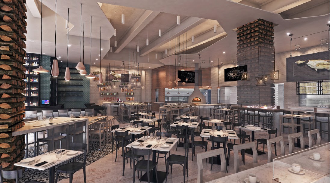 Designed by the renowned Thomas Schoos of Schoos Design, Bottega Americano’s 8,000 square foot interior pays tribute to 1950s Italian glamour with a blend of crisp, modern graphics and old-world charm. Distinctive black and white tile flooring will depict silhouettes of cutlery and produce on the vine, stacks of firewood for use in the stone fire pizza oven will flank the dining room, and nostalgic images of Italian culture will grace the walls. Communal tables promise a social experience for all diners.