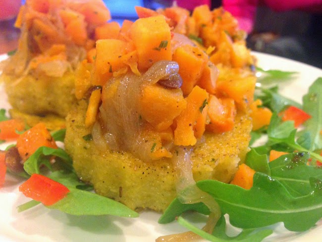 Butternut Polenta Bites ($5.95) - pesto baked polenta topped with roasted butternut squash, caramelized onions and toasted pumpkin seeds in balsamic over arugula.