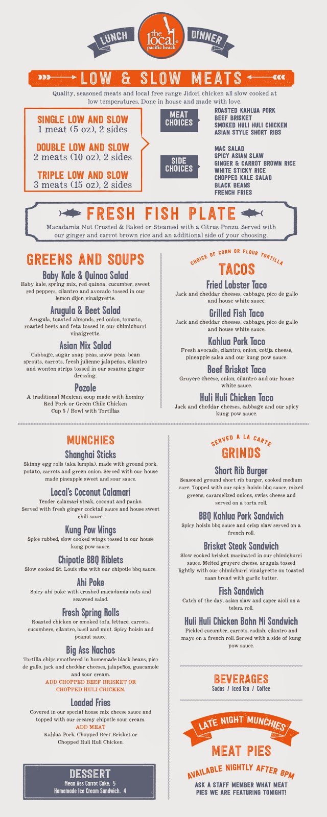 The menu blends The Local favorites, pub-style grub, and coastal inspired dishes. Offering lunch and dinner, food items include a variety of slow cooked meats, fresh fish, tacos, sandwiches, salads and a an eclectic list of starters.