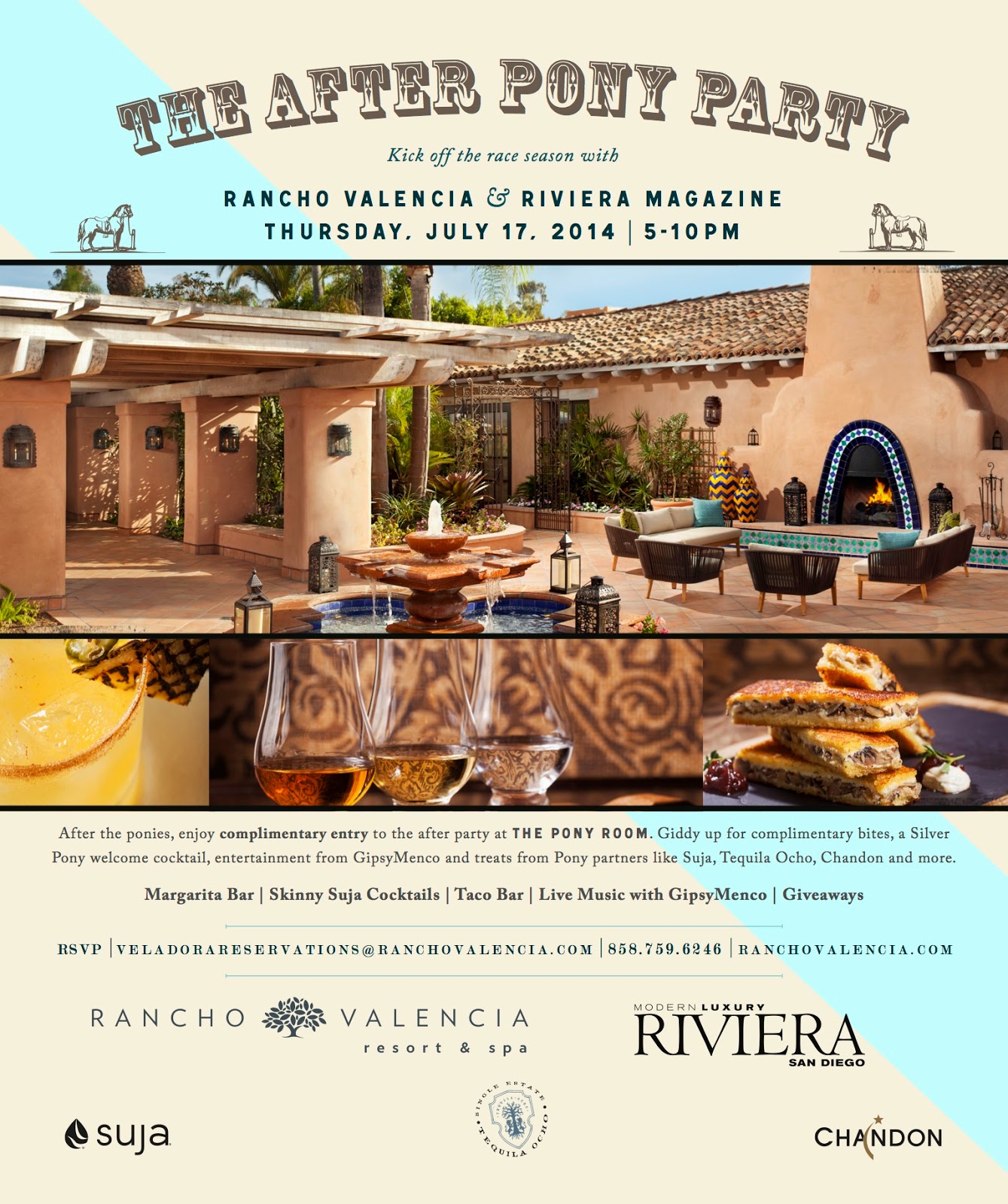 Giddy Up to Rancho Valencia Resort & Spa as they host their official Opening Day After Party with Riviera Magazine, called "The After Pony Party" on Thursday, July 17 from 5-10 pm. Guests can kick off the races and enjoy the resort's complimentary 25th anniversary cocktail, The Silver Pony, and signature bites along with Skinny Suja cocktails, live music from GipsyMenco, $6 Margarita Bar, $3 Taco Bar, and special giveaways. Entry is complimentary, but reservations are recommended and can be made by calling 858-759-6246.