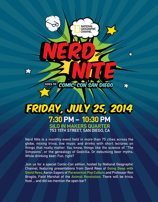 Nerd Nite - Hosted by National Geographic Channel, after the Comic-Con exhibit floor closes on Friday July 25, guests are invited to SILO in Makers Quarter to join a fun night of trivia and three presentations by some of NatGeo’s leading personalities. Guests will learn from David Rees of Going Deep with David Rees, Professor Ron Broglio of Animal Revolution, and Paranormal Pop Culture‘s Aaron Sagers. The event will be held from 7:30-10:30 pm with complimentary alcoholic beverages and complimentary admission.