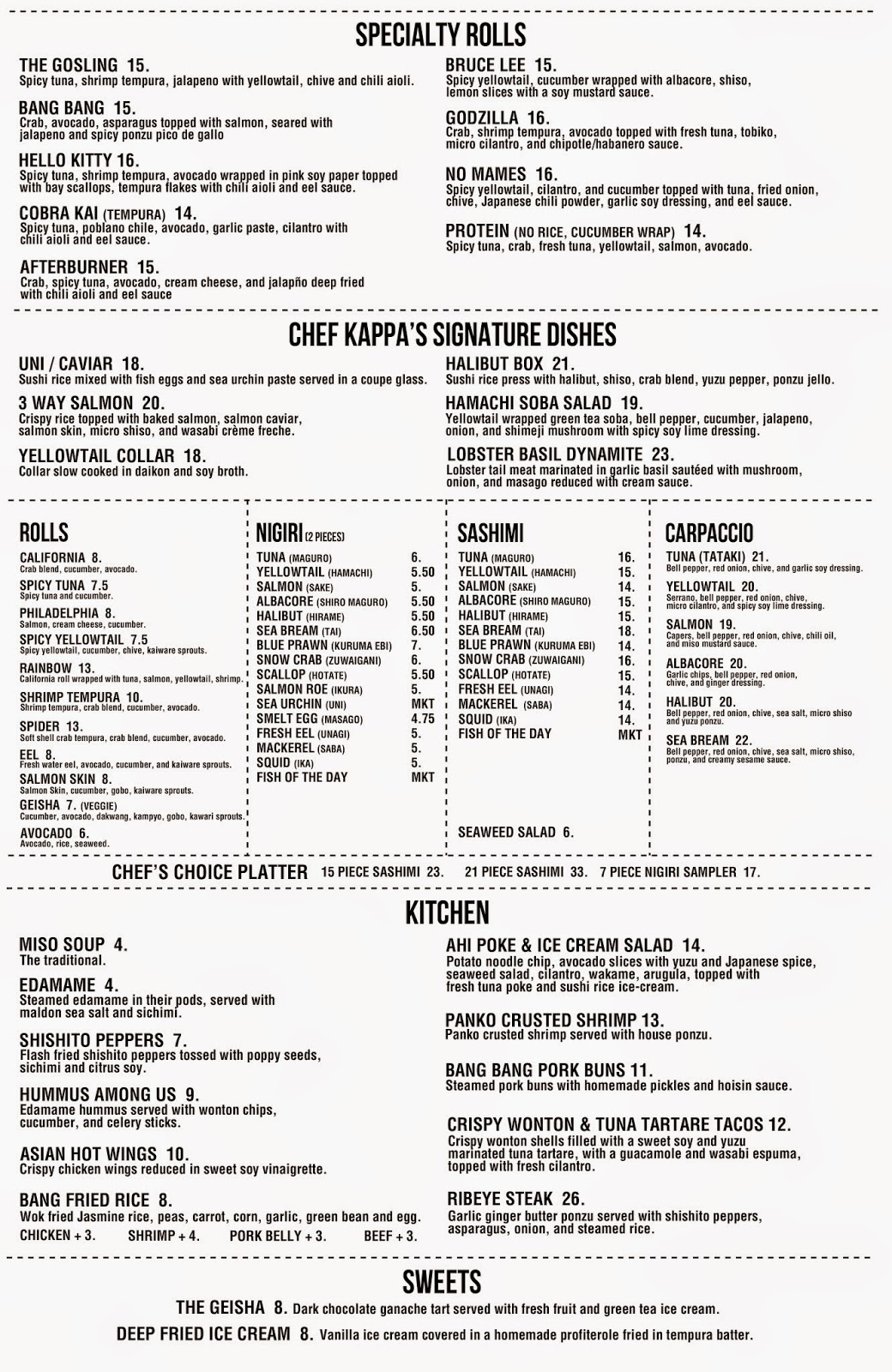 With a greater focus and attention to their sushi, Chef Kappa has introduced a variety of new specialty rolls including the Godzilla, made with crab, shrimp tempura, avocado topped with fresh tuna, tobiko, micro cilantro and chipotle / habanera sauce, the Karate Kick, made with crab, spicy tuna, avocado, cream cheese, and jalapeño deep friend with chili aioli and eel sauce, and the Kill Bill, made with spicy yellowtail, cilantro and cucumber, topped with tuna, fried onion, chives, Japanese chili powder, garlic soy dressing and eel sauce.