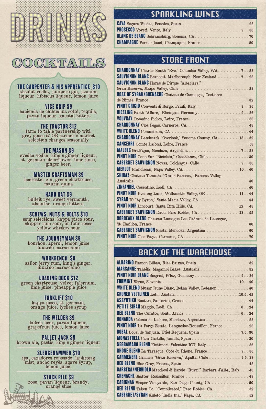 OB Warehouse was designed by local designer Philippe Beltran (100 Wines, Indigo Grill, BO-beau) who used recycled and re-purposed materials to create the industrial-chic, eclectic 2nd story space that previously housed Portugalia restaurant. The space looks amazing and features such highlights as an Airstream trailer attached to the kitchen, antique signs and fixtures, and 24 beer taps made with old hand tool handles.