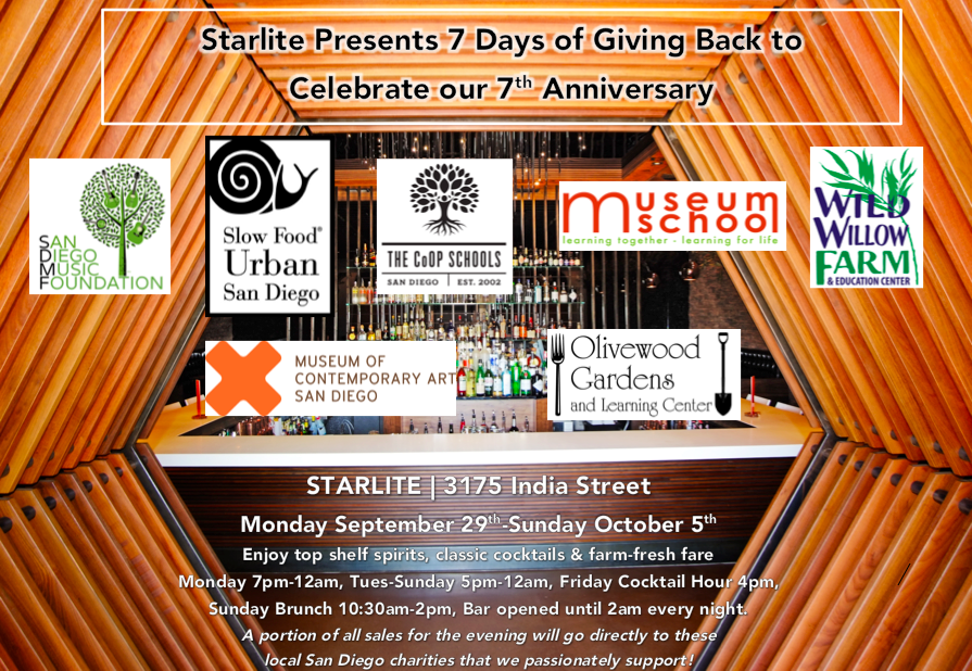 Starlite will also offer seven evenings of giving back to local charities, donating a portion of proceeds of all sales to seven area charity partners. The 7 year anniversary, 7 days of charity schedule includes the following charities: