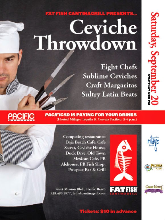 On Saturday, September 20, from 5-8pm, Fat Fish Cantina Grill and Pacific San Diego Magazine are holding a "Ceviche Throwdown" on Fat Fish's outdoor patio in Pacific Beach. Chefs from local popular restaurants known for their delicious and unique ceviche recipes will go head to head, and foodies are invited to come sample some of the best ceviche in town. A panel of 3 judges and the crowd will cast in their votes to choose the Ceviche King or Queen. There will be live music, drink specials, and food lovers from all around San Diego! We have two tickets to attend the event for one lucky ceviche-lover. Read more and enter our raffle!