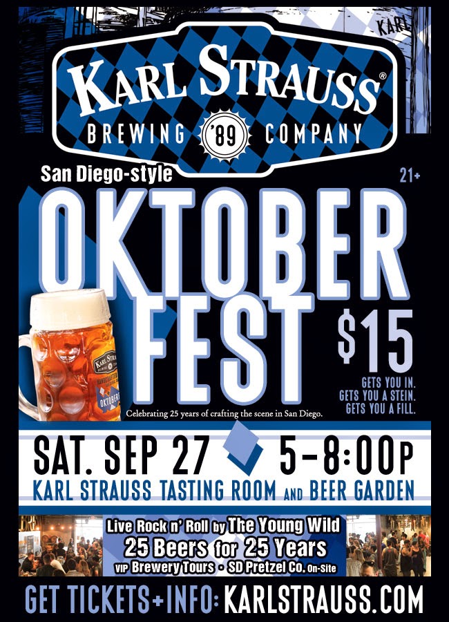 To celebrate 25 years of pioneering craft beer, Karl Strauss Brewing Company is throwing a San Diego-style Oktoberfest on Saturday, September 27, from 5-8pm at its Tasting Room and Beer Garden in Pacific Beach. For the cost of admission, the event includes a Karl Strauss beer stein with first fill free from a choice of 25 beers, including this year's Oktoberfest brew, live music and brewery tours.
