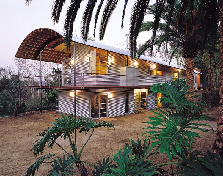 · A very unique home in Del Mar, completed by Cheng Design, that derives inspiration from Airstream trailers and Quonset huts. The design pits hard-edged industrial materials (concrete block, galvanized siding, steel columns, stainless steel cable and welded I-beams) against softer residential elements (stained-wood siding and a grid of exposed wood framing that supports the roof) and custom interior details (polished concrete floors, stainless steel kitchen hood, custom made concrete countertops and walls).