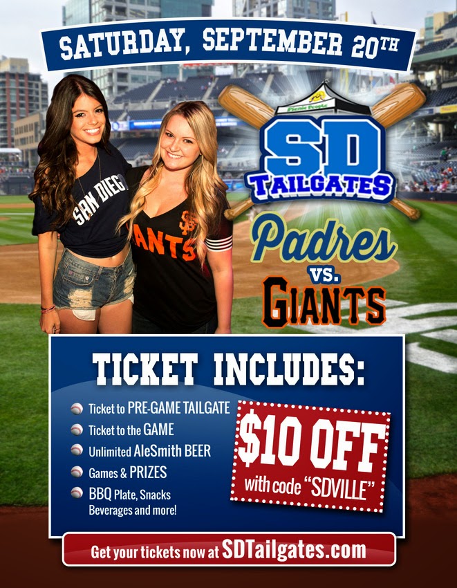 Tailgate plus game passes are currently $55, tailgate only is $39, and designated driver and under-21 passes are $30, but SanDiegoVille readers save $10 per ticket by using promo code SDVILLE at check out. The SD Tailgates party takes place at Padres Tailgate Lot on 14th & L St. in the East Village. Tailgate check-in begins at 2:30pm, with the party taking place from 3-5:10pm. The games starts at 5:40pm. For more information and to get your tickets, visit sdtailgates.com.