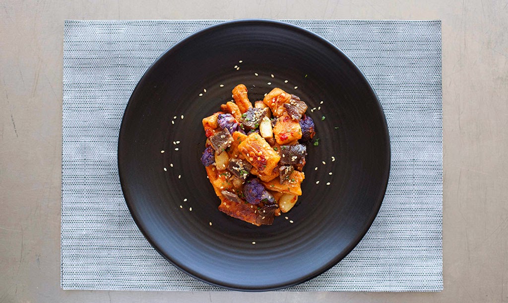 The restaurant has interesting design elements, a modern, exhibition style kitchen and vivid pops of color. Custom tables and benches line the patio for outdoor dining while large windows open out from the bar, allowing the energy of the restaurant to draw people inside. A curved, wave-like wood lathed ceiling defines the bar space, while large communal dining tables line the main room, offset by colorful, old-school classroom chairs and tip slots a la Vegas in the center of each table.