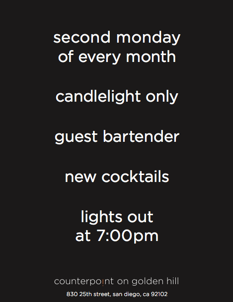On Monday, October 13, come on out to Golden Hill for the inaugural Blackout @ Counterpoint - a series that will take place on the second Monday of every month. As the name implies, the lights will go out right at 7pm and the intimate neighborhood restaurant and bar will be illuminated by candlelight alone. Well known cocktail guru Bryan Dietz will be filling in behind the bar as part of Blackout @ Counterpoint’s guest bartender series. He’ll be putting together three specialty cocktails for the evening including the Spanish Fly (Mezcal, Fernet-Branca, Mexican Coca Cola and Lime) and the Italian Mule (Ginger Beer, Peach Bitters, Fernet-Branca and a Lime Wheel Garnish) with optional food pairings from Counterpoint Executive Chef Rose Peyron.