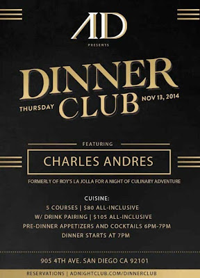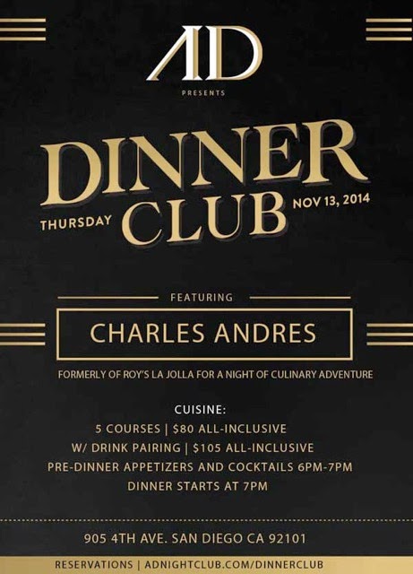 AD Nightclub is starting it's dinner club, an ongoing dinner series featuring high-profile guest chefs, taking flight this Thursday, November 13 when Chef Charles Andres of Roy's La Jolla takes 50 lucky diners on an exclusive culinary adventure through the South Pacific and Asia. A multi-sensory experience, fresh and modern flavors will be accompanied by complementary lighting, visuals and music.