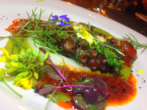 Our fourth course came as an exciting kaleidoscope of beautiful colors. Tender wood fired grilled octopus, poblano chile chimichurri, kalamata olives, chorizo and fresh herbs made this a sensational plate.