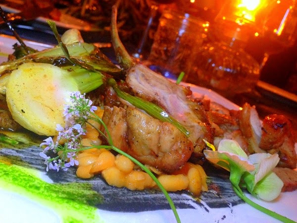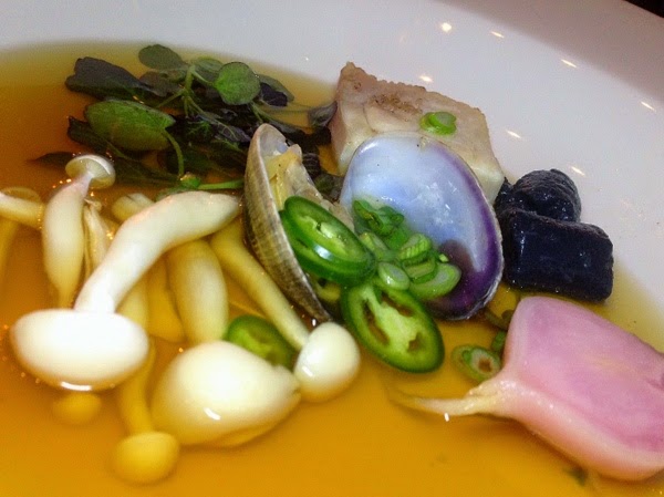 Next up was Chef Andrew Spurgin's melding of Japanese and French culinary styles with his bone broth consume/dashi. This dish was an absolute work of art that was packed with complex flavors - a slice of fresh caught Baja yellowtail, a grilled Manilla Clam, black charcoal gnocchi, beech mushrooms, pink turnip, red watercress and serrano pepper - all forming a bouquet that was only enhanced by a most delicate broth.
