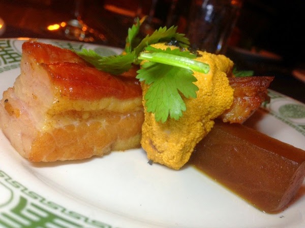 Course #2 was introduced by Chef Rob Ruiz - a confit bacon lardon with braised daikon, uni with black lava salt, cilantro and the Japanese mint, perilla. The combination of salty pork with creamy uni and sweet daikon was fantastic both in taste and contrasting texture.