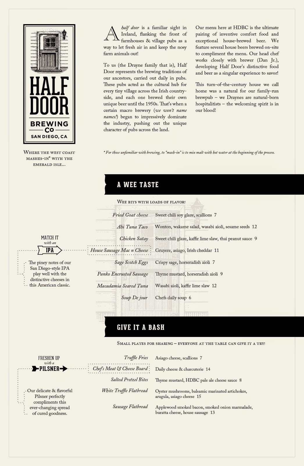 A half door is a familiar sight in Ireland, flanking the front of farmhouses & village pubs as a way to let fresh air in and keep the nosy farm animals out, the inspiration behind the name Half Door Brewing. To the Drayne family, owners of Half Door, as well as The Field Irish Pub in the Gaslamp, the name represents the brewing traditions of their ancestors, as carried out daily in pubs around Ireland. These pubs acted as the cultural hub for every tiny village across the Irish countryside, and each one brewed their own unique beer until the 1950s. Daniel Drayne, Jr., is Half Door's co-owner and head brewer.