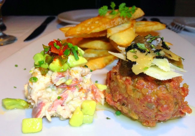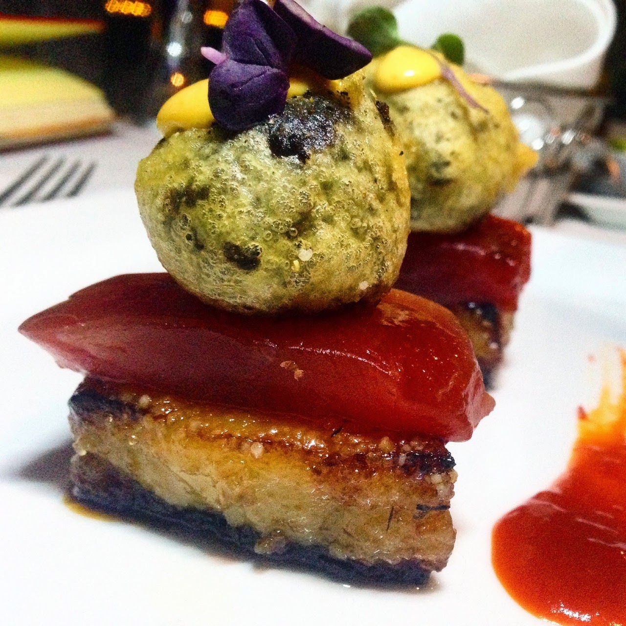 Ahi/Pork Belly/Black Garlic Tempura Stack at Top of the Market, Downtown - This dish consists of Fijian ahi yellowtail sashimi atop brown sugar and garlic-roasted pork belly, capped off with a black garlic tempura ball. Just by the description of ingredients, you can tell its a winner. Chef Ivan Flowers blew us away with this diverse stack of perfection. It's something that you'll wish you could savor for hours then dream about for many nights after. Call and make sure it's available, because it's served as a special.